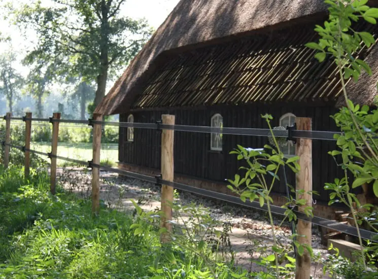 Deze weideafrastering met schriklint en Acacia (Robinia) palen biedt een natuurlijke uitstraling. De robuuste Robinia palen passen perfect in een landelijke omgeving en gaan dankzij hun uitzonderlijke hardheid en natuurlijke duurzaamheid jarenlang mee. Het schriklint zorgt voor een veilige en effectieve afrastering, geschikt voor diverse dieren. Een ideale oplossing voor wie waarde hecht aan een onderhoudsarme, milieuvriendelijke en praktische weideomheining.