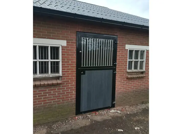 Deze paarden staldeur solid is uitgevoerd met een boven- en onderdeur, waarbij de bovendeur onafhankelijk te openen en te sluiten is, RVS vingerslot en nachtsluiting, bovendeur voorzien van 6 mm veiligheidsglas en uitneembare tralies, 32 mm kunststof planken in de kleur grijs, Zwarte poedercoating en een inbouwmaat van 120 x 220 cm. Het kozijn heeft een hoeklijn van 65 x 100 mm en is uitgevoerd met lipjes voor een extra verstevigd kozijn.