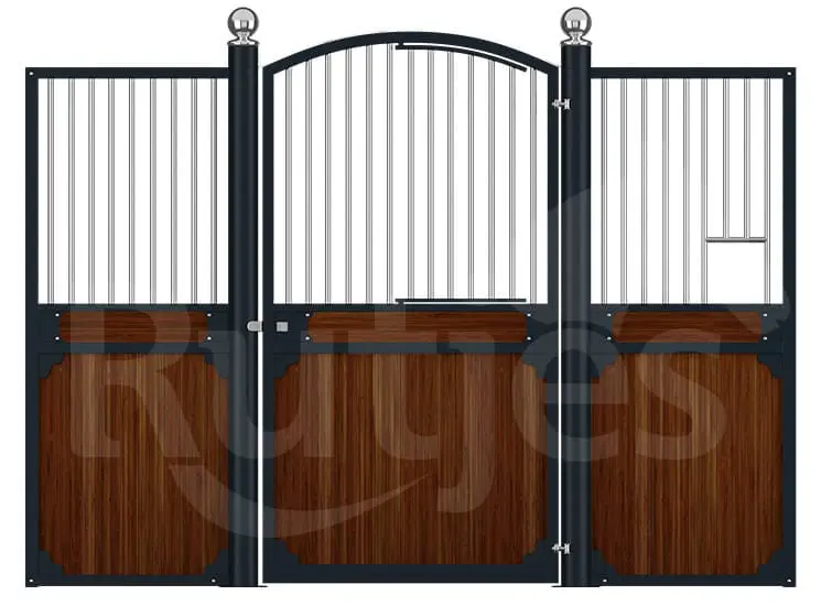 Deze voorwand heeft een voeruitsparing, RVS vingerslot en nachtsluiting, ronde pilaren Ø 128 mm met zilveren sierbol, spijlen van Ø 26.9 mm, zwarte poedercoating, sierplank, RVS spijlen en 32 mm gecoate bamboe planken.