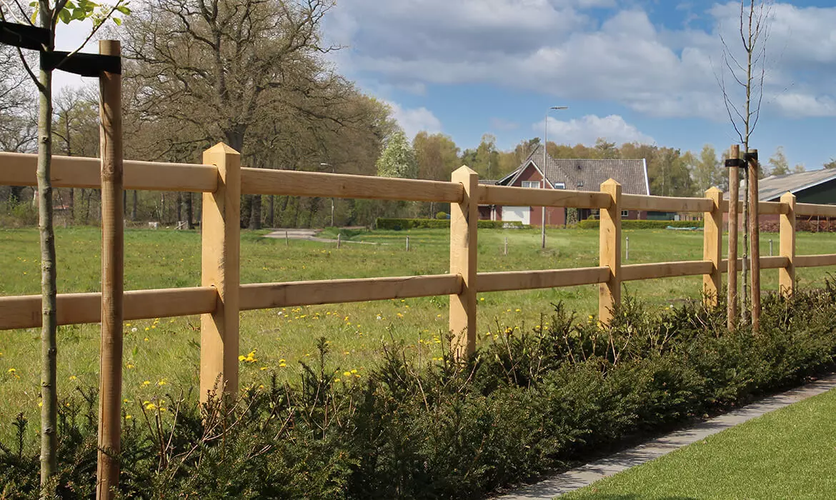 Onze eiken omheining zie je hier in een nieuw jasje. Standaard heeft deze robuuste omheining van eikenhout rechte liggers.