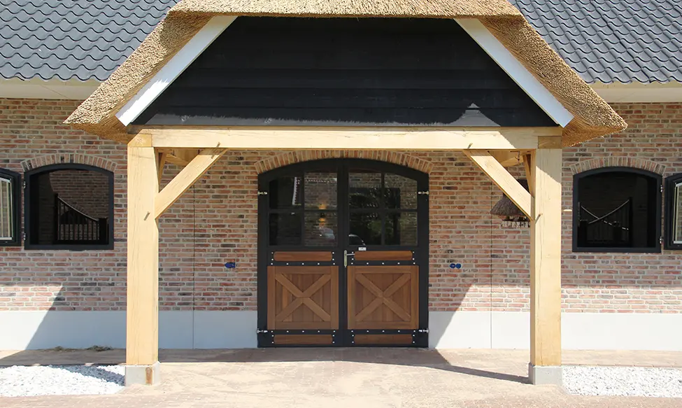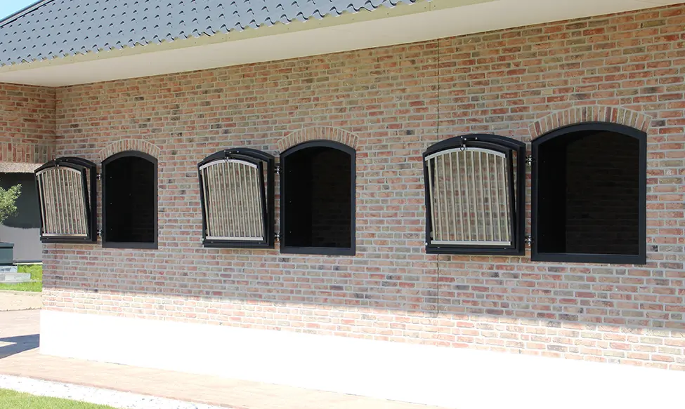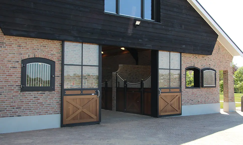 De paardenboxen zijn elk voorzien van mooie grote ramen zodat de paarden ook heerlijk naar buiten kunnen kijken. De ramen hebben zowel een draai als kiepfunctie en kunnen hierdoor het hele jaar gebruikt worden voor frisse lucht in de stallen. Voor dezelfde luxe uitstraling zijn de stalramen voorzien van een podercoating, toog en rvs spijlen. Om de ramen eenvoudig schoon te maken, zijn de tralies uitneembaar. De twee grote schuifdeuren aan het begin en eind van de stalgang zorgen voor veel licht. In de zomermaanden kunnen de deuren tevens open gezet worden voor een lekker fris briesje in de stal. Ook de deuren zijn voorzien van poedercoating en bamboeplanken voor dezelfde luxe uitstraling aan de buitenkant van de stal.