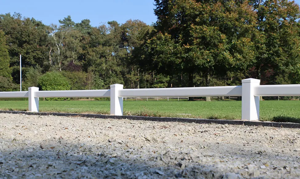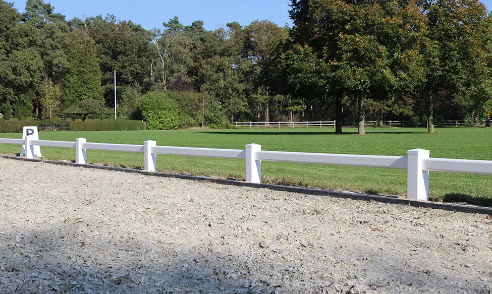 Deze klant had voorheen een verplaatsbare dressuurring om de trainingsbaan staan, maar nadat de omheining elke keer omwaaide met flinke storm vlagen besloten ze de dressuurring te vervangen voor een permanente variant. De keuze viel voor onze luxe dressuurring die eenvoudig in de grond te monteren is. Dit kwalitatief hoogwaardige dressuurring zorgt voor een strakke en solide afwerking van de dressuurbaan. De dressuurring is gemaakt van uv-bestendig en dikwandig kunststof, waardoor het een erg duurzaam en onderhoudsvriendelijk product is. De diamantkop en de unieke ovale ligger geeft de omheining een ongekende luxe uitstraling.